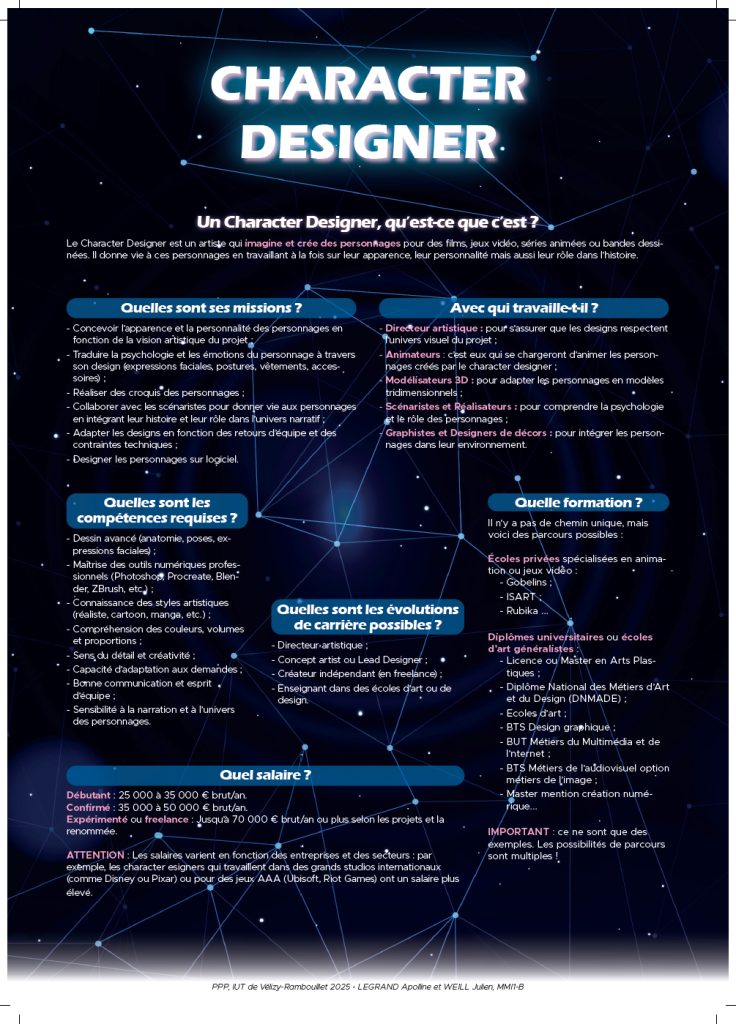 - Objectif principal : Réaliser un poster visant à informer sur le métier de character designer